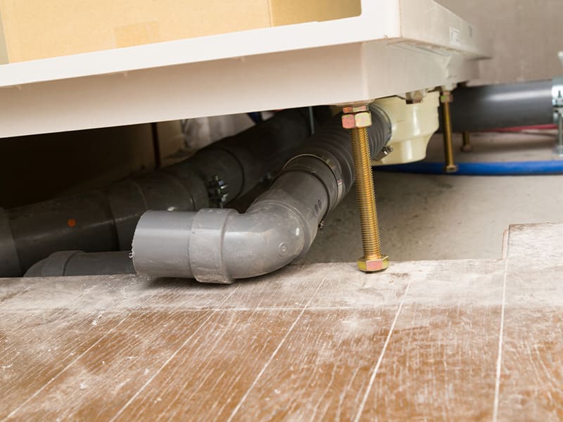 いよいよシステムバスの組立に入ると、床のフレームから配置していきます。水平を確認しながら組み立てて、排水管の接続を行い、土台を作ります。